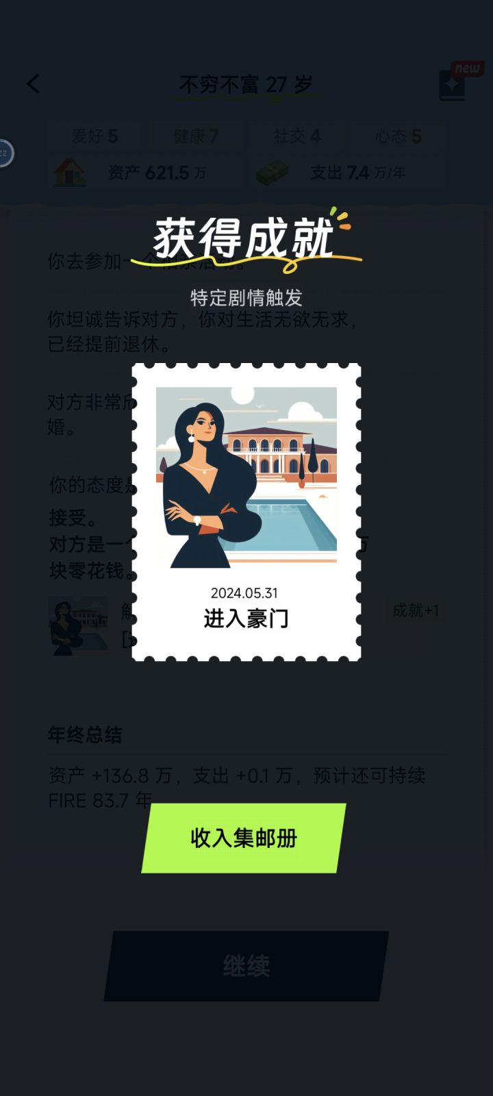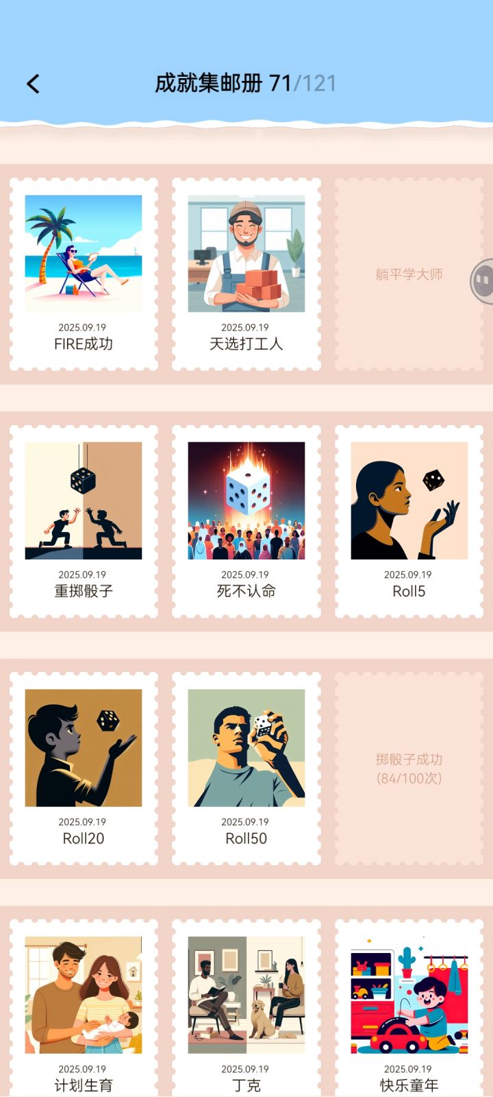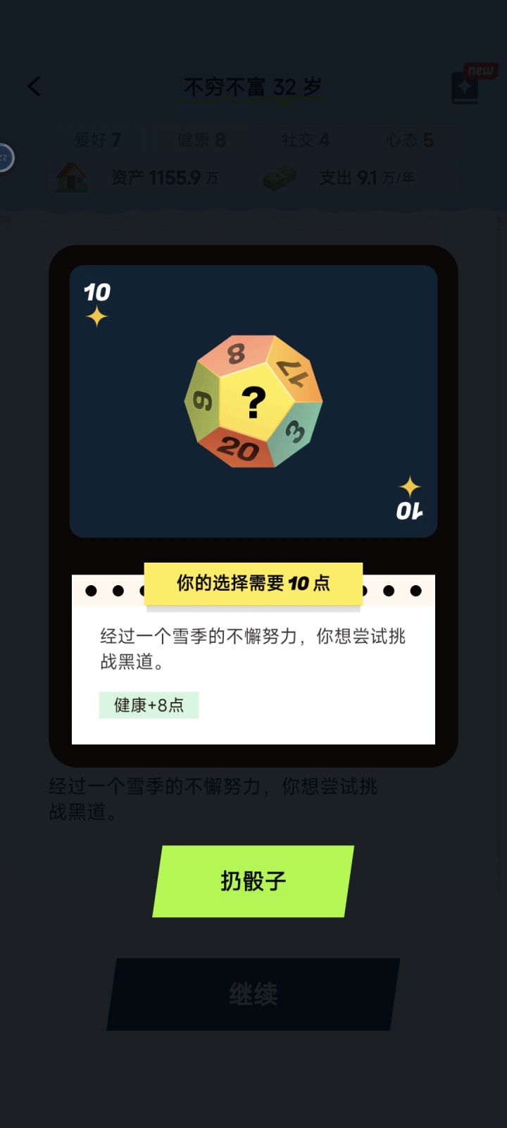 哈哈哈哈本来想打四颗星,不过想想还是觉得三颗星差不多了,我现在玩的是新版了,投骰子已经有加点了,通过率高了非常多,确实成就解锁不少哈。总之我觉得这个游戏还挺有意思的,成就都是突发事件或者一直模拟刷出来的,我玩了也不怎么久,刷了七十多种的成就,打算试试看能不能把一百二十多种都集齐…