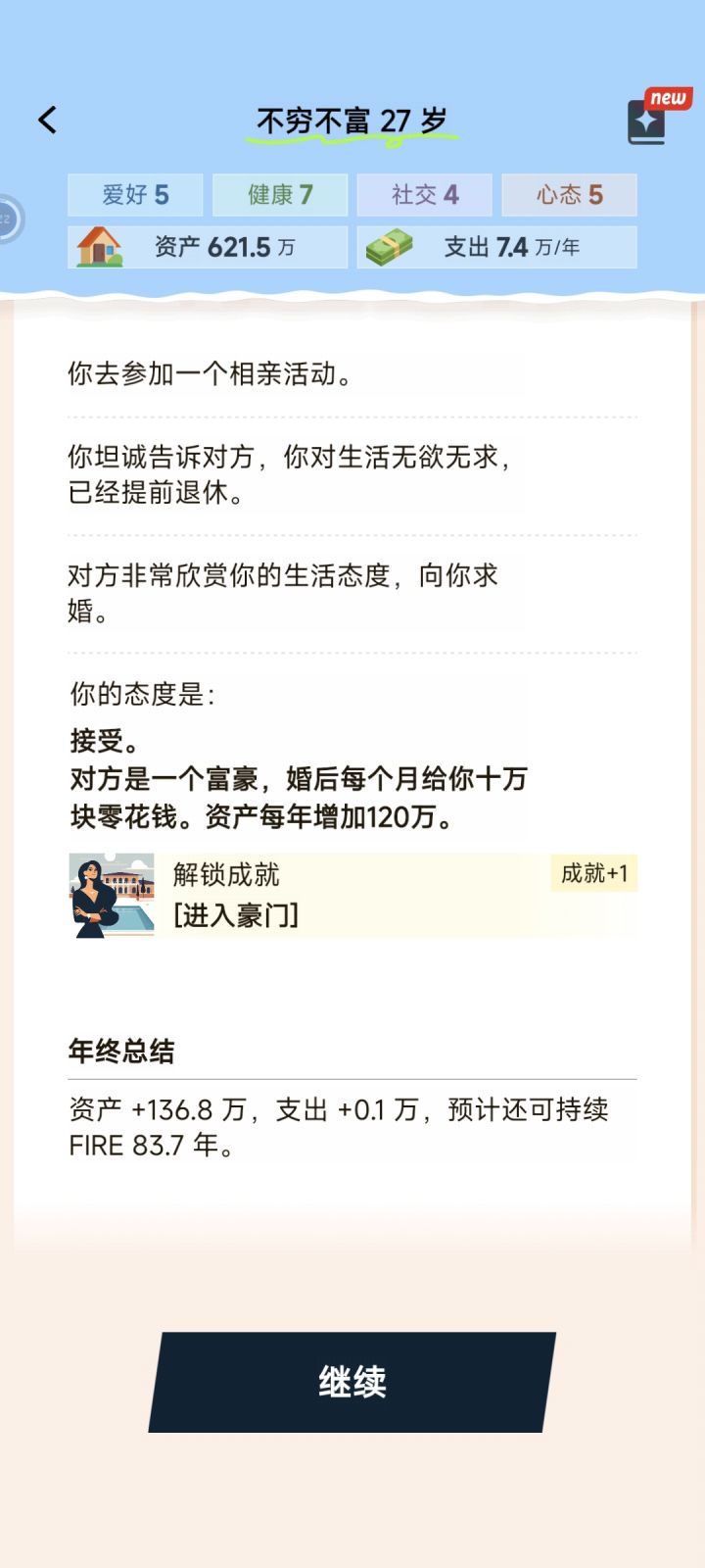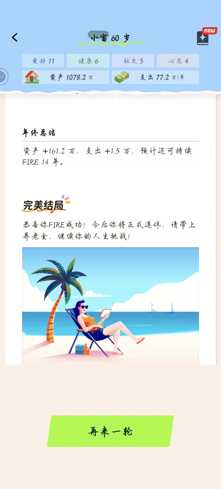题材非常新颖,比较小众,非常适合已经工作多年想要感受fire生活的社畜😂可以看看自己到底适不适合提前退休,很多选项引发对生活本质的思考,看得出制作组还是很用心的。