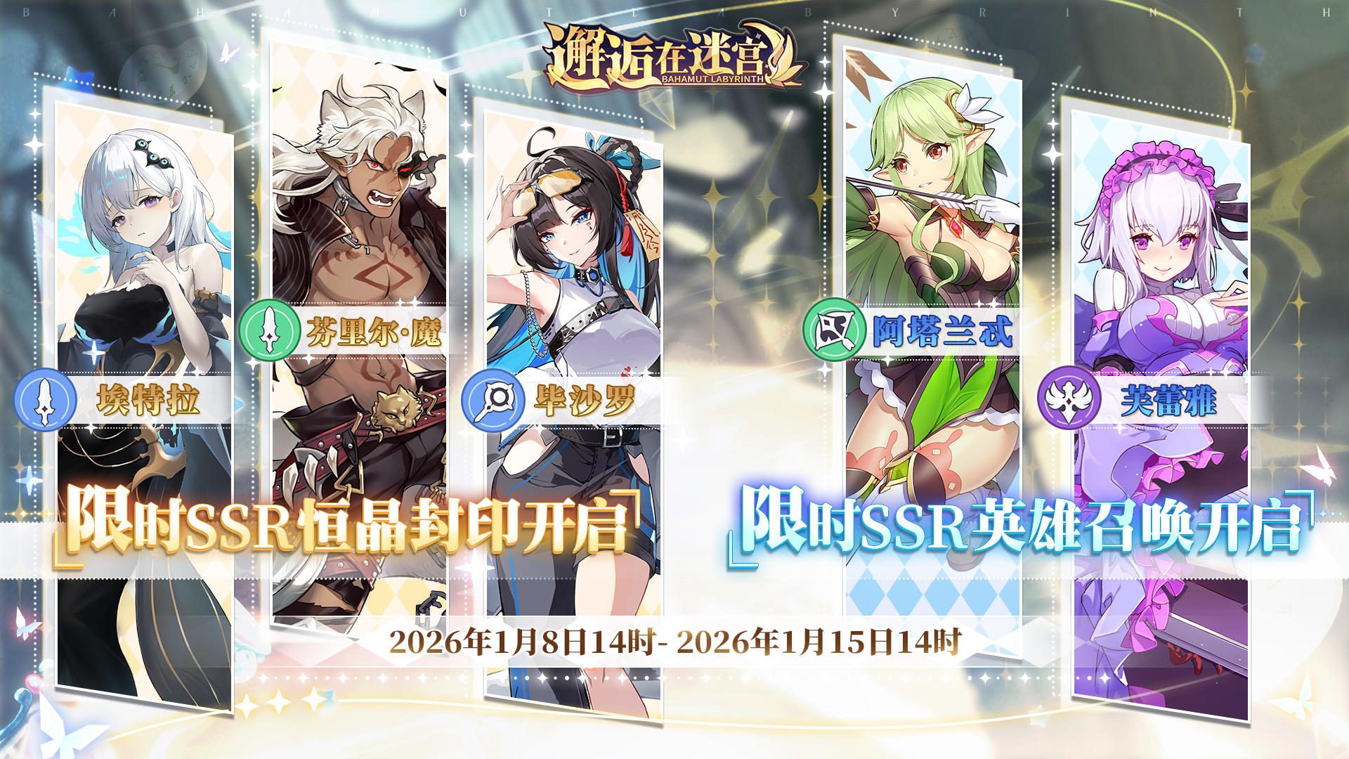 亲爱的冒险者,本期恒晶封印及英雄召唤预告如下。 卡池开启时间:2026年1月8日14:00 - 2026年1月15日14:00本期限时SSR恒晶封印开启英雄:埃特拉、毕沙罗、芬里尔·魔限时恒晶封印记录解封进度与次数,完全解封上限为10次。本期限时SSR英雄召唤开启英雄:芙蕾雅、阿塔兰忒卡池开启期间,限时召唤英雄概率提升,具体如下:限时SSR英雄:1.40%其他SSR英雄:2.80%S