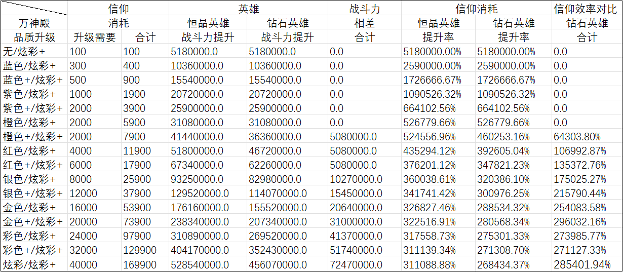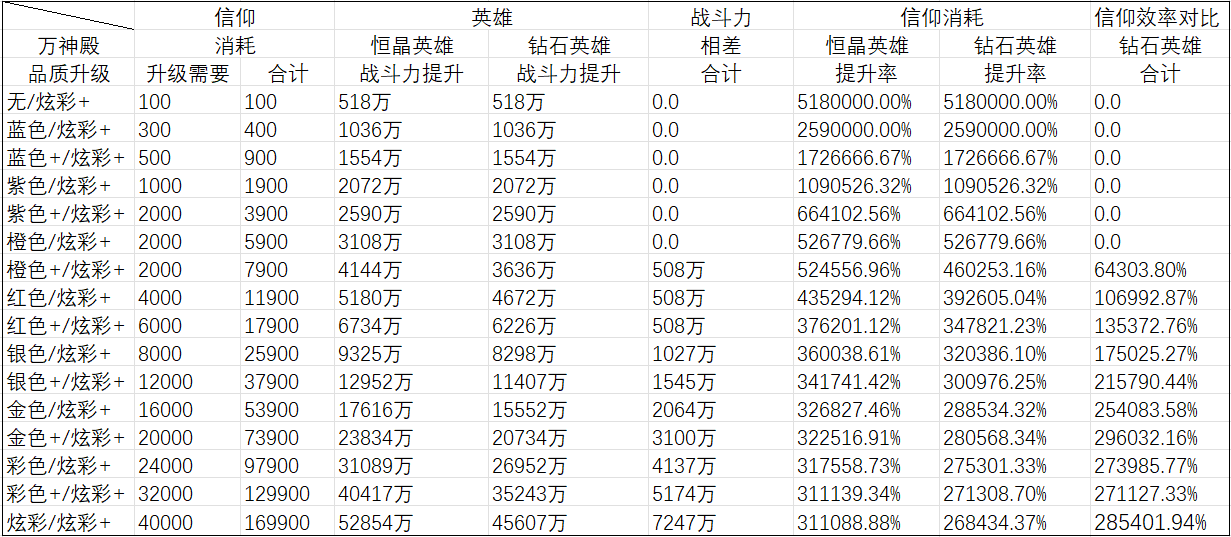 开始正题前先说一下。影响万神殿信仰和战斗力的因素有很多,楼主使用个人账号,因此这并非固定比例,仅供参考。说明:1.计算有误请指正。2.信仰消耗提升率是用“战斗力提升”除以“信仰消耗”算出来的。3.其它战斗力系统会对信仰与战力提升之间的转化效率产生影响。英雄羁绊、宝石、主楼层上阵角色、上阵角色武具、神语,玩偶屋、卷轴、神龙守护等系统都会对战力提升产生影响。所以具体,战斗力提了多少因人而