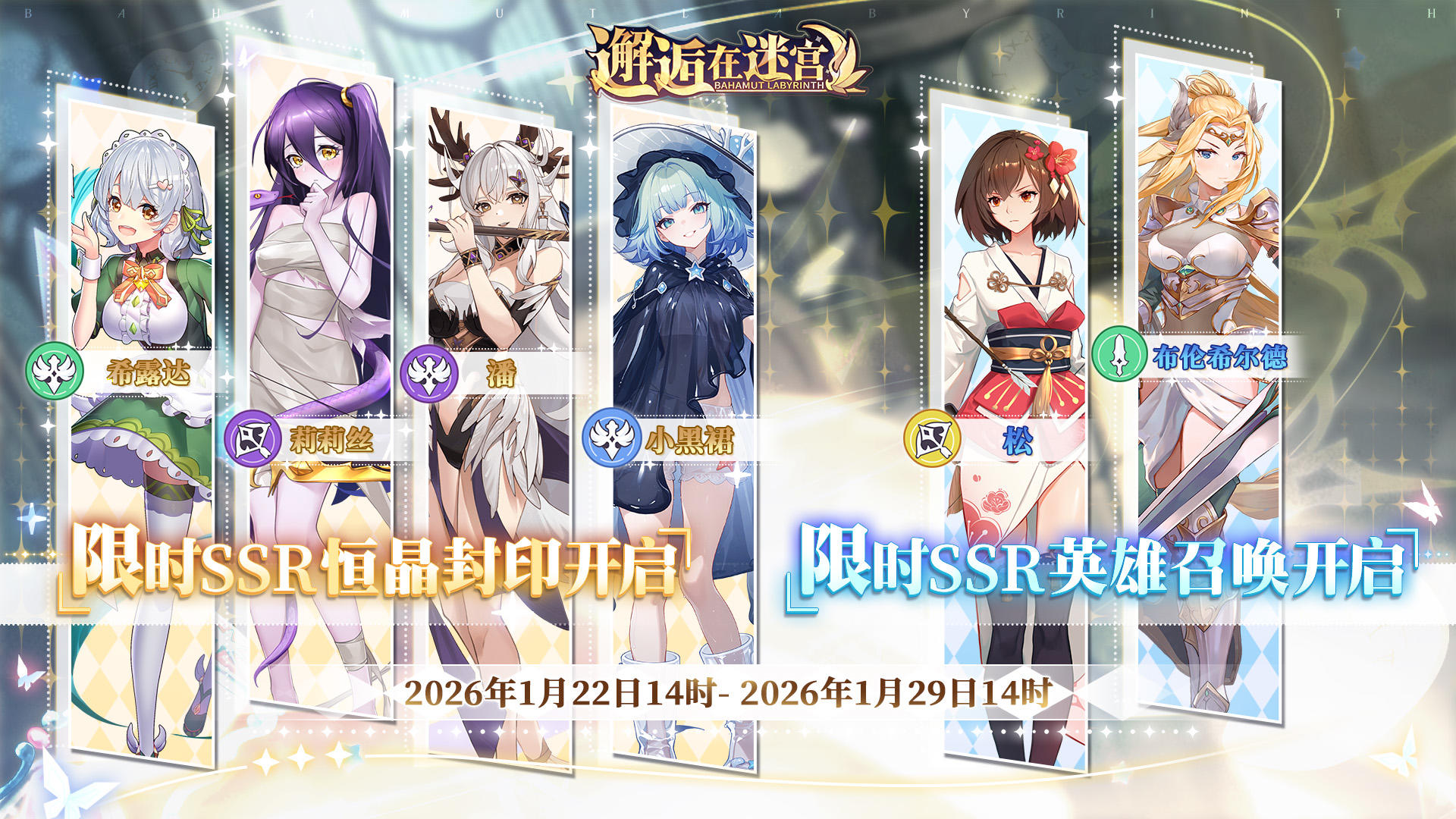 亲爱的冒险者,本期恒晶封印及英雄召唤预告如下。 卡池开启时间:2026年1月22日14:00 - 2026年1月29日14:00本期限时SSR恒晶封印开启英雄:潘、莉莉丝、希露达限时恒晶封印记录解封进度与次数,完全解封上限为10次。本期限时SSR英雄召唤开启英雄:松、布伦希尔德卡池开启期间,限时召唤英雄概率提升,具体如下:限时SSR英雄:1.40%其他SSR英雄:2.80%SR英雄