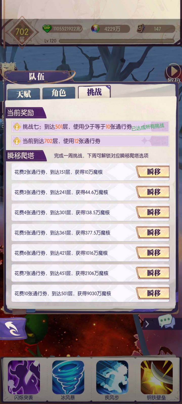 这个攻略大体就是一些新阵容极限层数的记录。含大量凹三攻操作更适用一些老登使用,不建议没有永久卡的萌新学习。强势英雄:蓝色:没区别紫色:木刺,光弓,火弓,水弓,水剑都比较强钻石:妖精摩根,艾拉/浮士德,肥鸭恒晶:芙蕾雅+玛维尔+兔子一、从头开始0币:93。目前0币试炼塔好像变简单了,点进去退出两小时,挂到11级就能横推到93层。英雄随便,有紫色就选紫的,神器轰击五星,技能老三样闪烁冰风暴