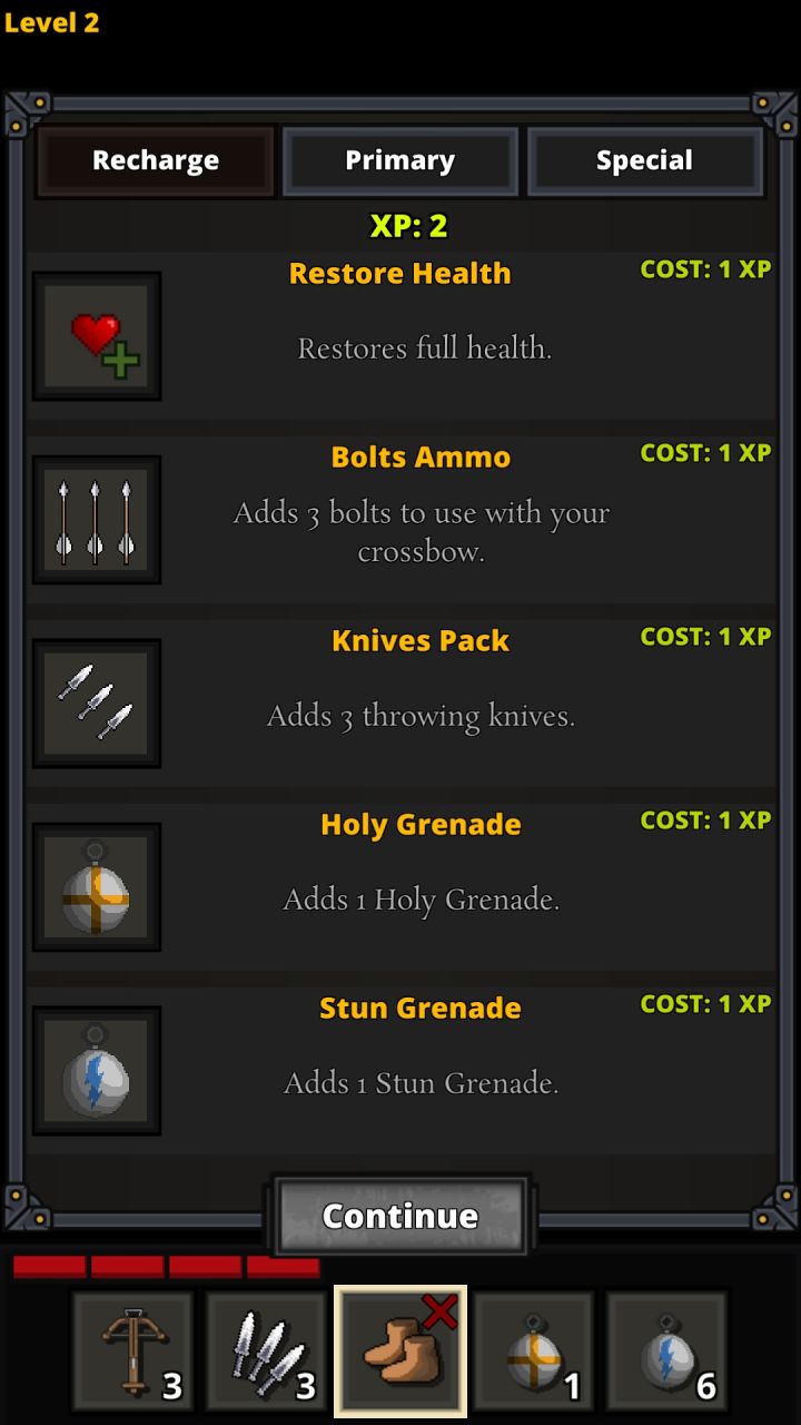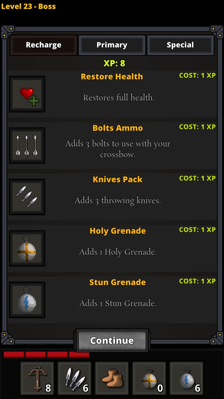 recharge选项:1.恢复所有生命2.获得3支箭3.获得3把小刀4.获得1个炸弹5.获得1个眩晕炸弹primary选项1.三颗心:增加一点最大血量2.指向右边的剑:和敌人相距一个格子时,向其前进发动冲锋攻击3.小刀:小刀攻击距离加一4.鞋子(带个+号):增加一格跳跃距离5:鞋子(带个?号):跳跃会使着陆点周围的怪眩晕6.箭:箭可以穿透敌人7.盾:受到远程攻击时,三分之