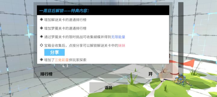 更新后请小伙伴们先打开【主菜单】-【收集物】-【特典】界面~如果是图1~特典还未解锁~可能是某一关的通关时间丢失,解决方法如下:1、在章节列表内查看每一关的下方是否都有通关时间统计。2、没有时间的关卡重新通关一次。3、查看特典是否解锁。(会尽快修复的!)如果特典界面是2,就可以找彩蛋,然后根据条件解锁所有特典内容了!(需要打开下方的特典开关哦!!!)