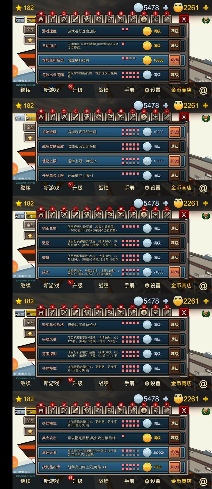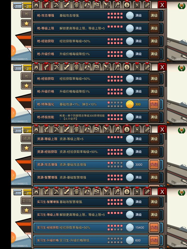 刷十万层最关键是金币等级够高,可适当氪一下金。一级出库300金币,每级多900金币。3300波之后可全程4倍速自动出怪挂机,不需要任何操作。每小时可打570-580波。一、需要的科技和战利品①银币科技全局:多怪10,四个主动全满,幸运至少三级(如图一)枪:全满,包括极资:等级上限、智慧满
