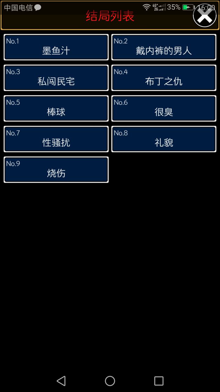 第一关:点击第一页上的黑色墨迹:来到第二页,先不用墨迹,先和每个人对话。对完话之后,将墨迹拖到黑衣人身上使用,辨认出真凶,过关:【该关卡其他结局收取】end1 end2在这个时候对墨鱼使用黑色墨迹,得到【END1 墨鱼汁】对带内裤的人使用黑色墨迹,得到【END2】第二关:点击桌子上的便条,得到便条(不拿也行,通关用不着)点击垃圾桶,得到空的布丁盒子来到第二页,还是先和每个人对话,