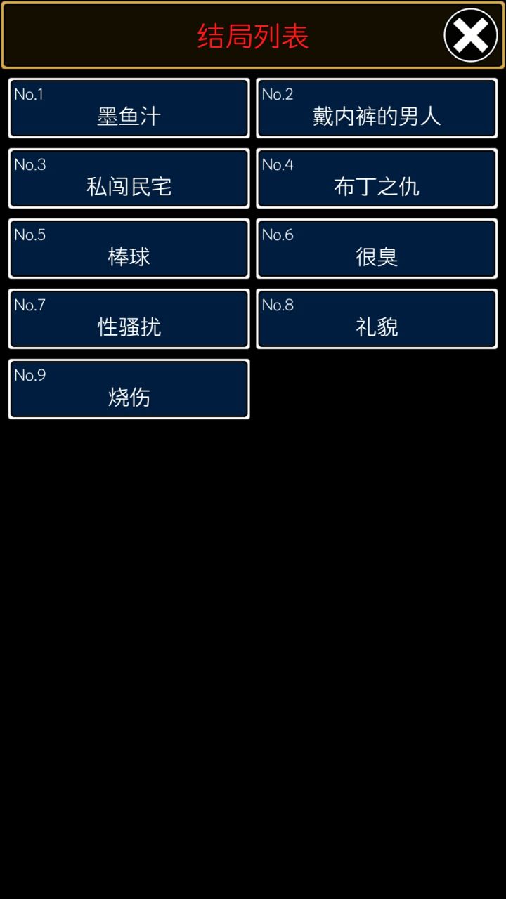 第一关:点击第一页上的黑色墨迹:来到第二页,先不用墨迹,先和每个人对话。对完话之后,将墨迹拖到黑衣人身上使用,辨认出真凶,过关:【该关卡其他结局收取】end1 end2在这个时候对墨鱼使用黑色墨迹,得到【END1 墨鱼汁】对带内裤的人使用黑色墨迹,得到【END2】第二关:点击桌子上的便条,得到便条(不拿也行,通关用不着)点击垃圾桶,得到空的布丁盒子来到第二页,还是先和每个人对话,