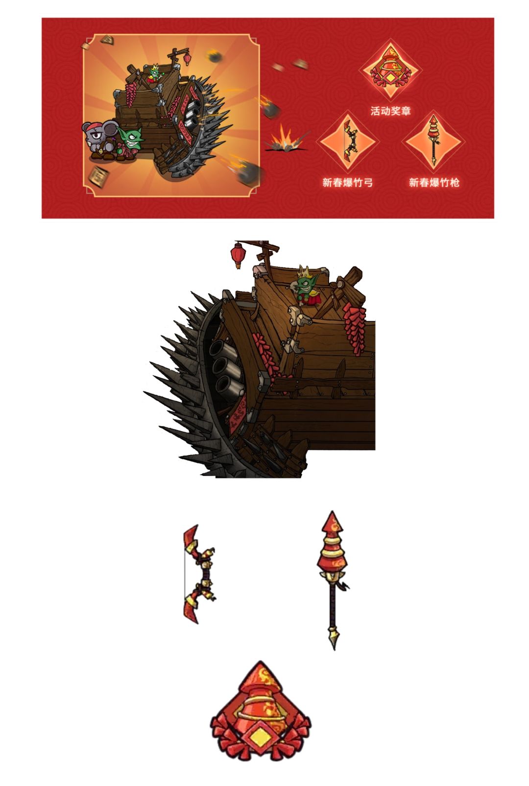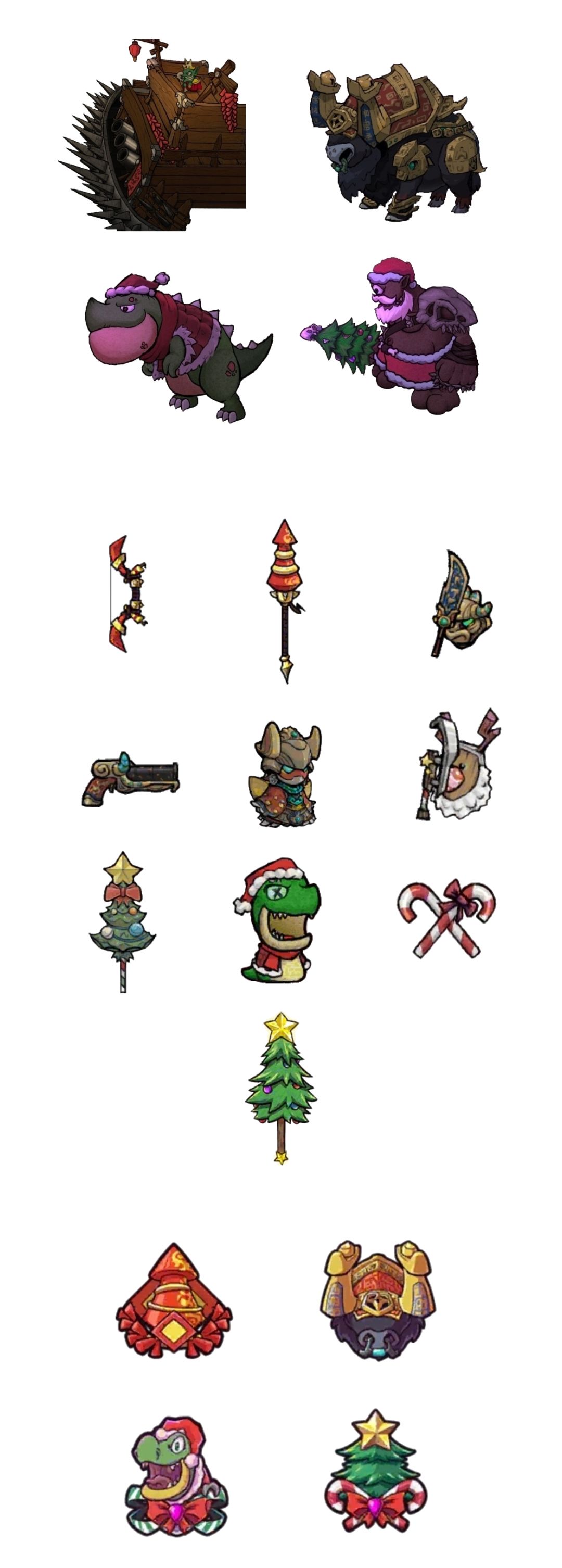 两大节日四大隐藏BOSS合集! 春节:新春不破号、春节版炎蹄 圣诞节:圣诞小狗、圣诞独眼巨人 四大隐藏BOSS解锁武器&盔甲 1、春节-新春不破号解锁武器:新春爆竹弓、新春烟火枪 春节版炎蹄解锁武器&盔甲:金牛祭祀礼剑、金牛祭祀礼枪、金牛祭祀礼装 2、圣诞节-圣诞小狗解锁武器&盔甲:驯鹿雪橇、圣诞树长枪、圣诞布偶 圣诞独眼巨人解锁武器:拐杖糖、圣诞树大剑 3、四大隐藏BOSS解锁徽章 春节:新春爆