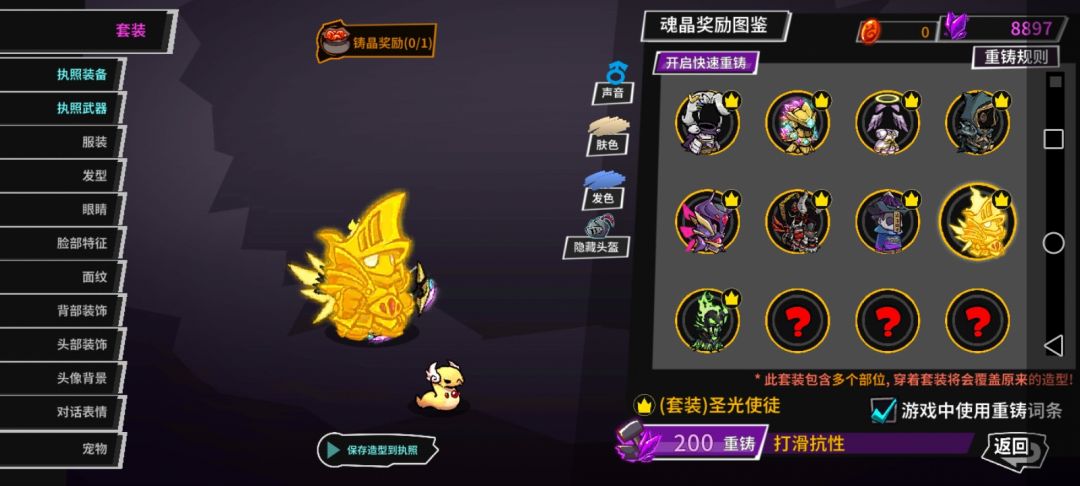 论重铸的方便性 首先作为一个手残党但又是老玩家我很惭愧因为我菜,但论重铸基本就是砸晶,上面图片大概率可以刷出对应攻击,攻速,大概5到6次左右,PS一次黄色的200晶,有15%攻速时可以无道具双刀但距离短往往第二刀打不到怪30%时远程攻击时只往左或右攻击时可以实现双刀重叠为一刀大大提高命中,近战一样无道具往一方向跳打可双刀,新手不建议加速度,需要注意的是套装如果装备时除了武器,眼睛,其他的效果将会全