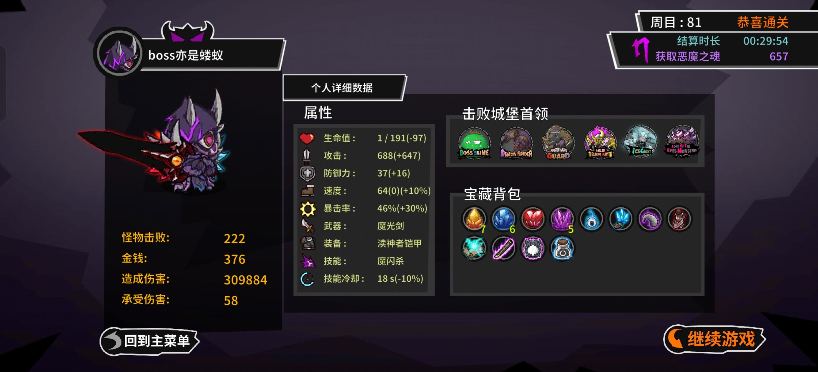 【自选挑战】❶减1%生命值增加2%伤害❷血量为1,吃食物增加护盾值❸生命值减半,攻击力翻倍 运气好捡了很多黄宝石,还有加攻击力的药水,偶尔能开出加攻击的灵魂结晶,然后又开宝箱出了【对80%生命值以上的敌人造成双倍伤害】和【第一刀必定暴击】的宝物,暴击来了真就是一刀秒怪,说是开挂了也不为过[表情_酷]#游戏日常 #失落城堡套装 还有还有这个【低语的使徒】是真帅啊,手感也好,等了一年了,喜欢的小伙伴不