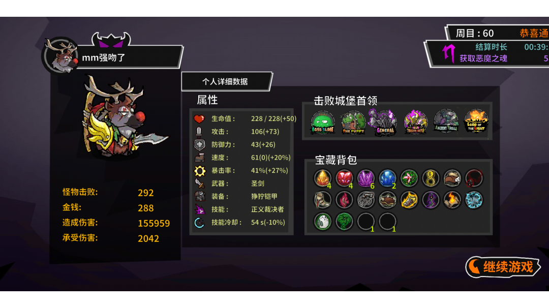 看了各种大佬的攻略,还是没通关过,因为啥,手笨(´▽`)ノ♪ 如视频只要玩城堡,就可以通关。不过我姓倒着写(鄙人姓吕) 特别感谢: 囍筷子送(攒)的90个饺子 独眼巨人小弟送的水晶(不然得多打两分钟) 感谢挑战模式送的食物无上限buff