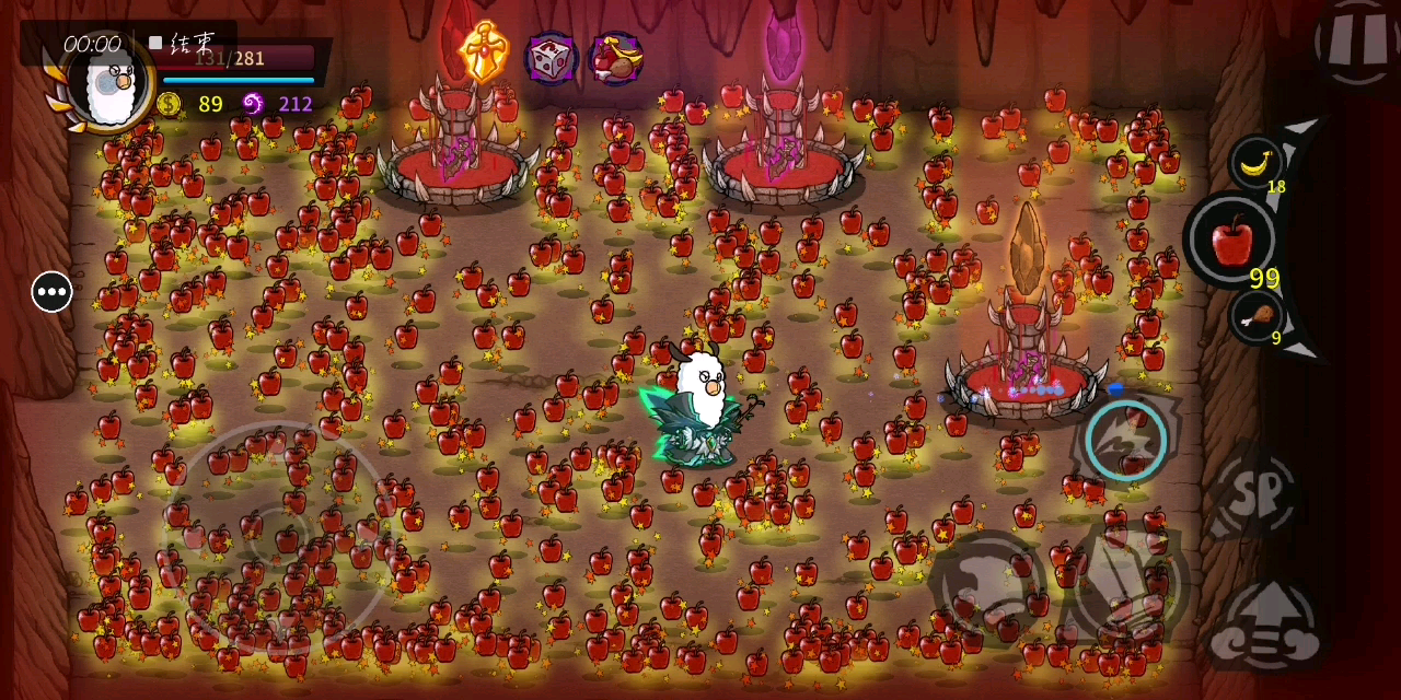 打每日挑战总有一些感觉对玩家有利的条件,比如这个没有主动道具但是可以把补给捡到99个。直接刷了10分钟出来99个苹果啦😄,真是个弟弟,随便吧这个武器留到4或5关再换强力武器,我不信2000血打不过2个boss😓,就是用邪神之触我都弹死。