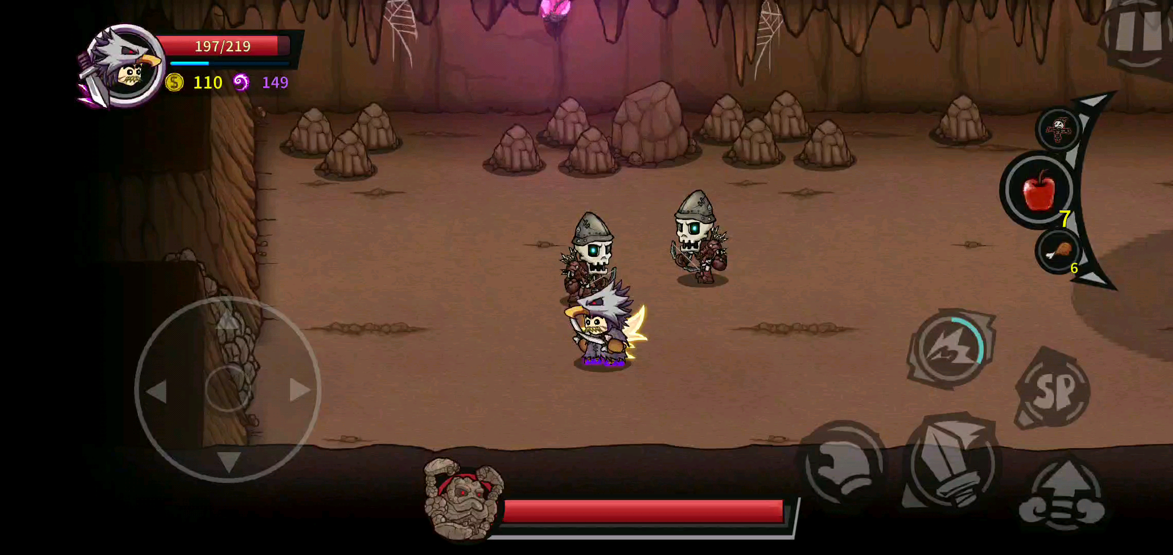 第三关的骷髅boss,本来想用法杖风筝死的,但这把无敌的剑太香了,就用了一顿希拉的操作打了半条血和开始猥琐打法了