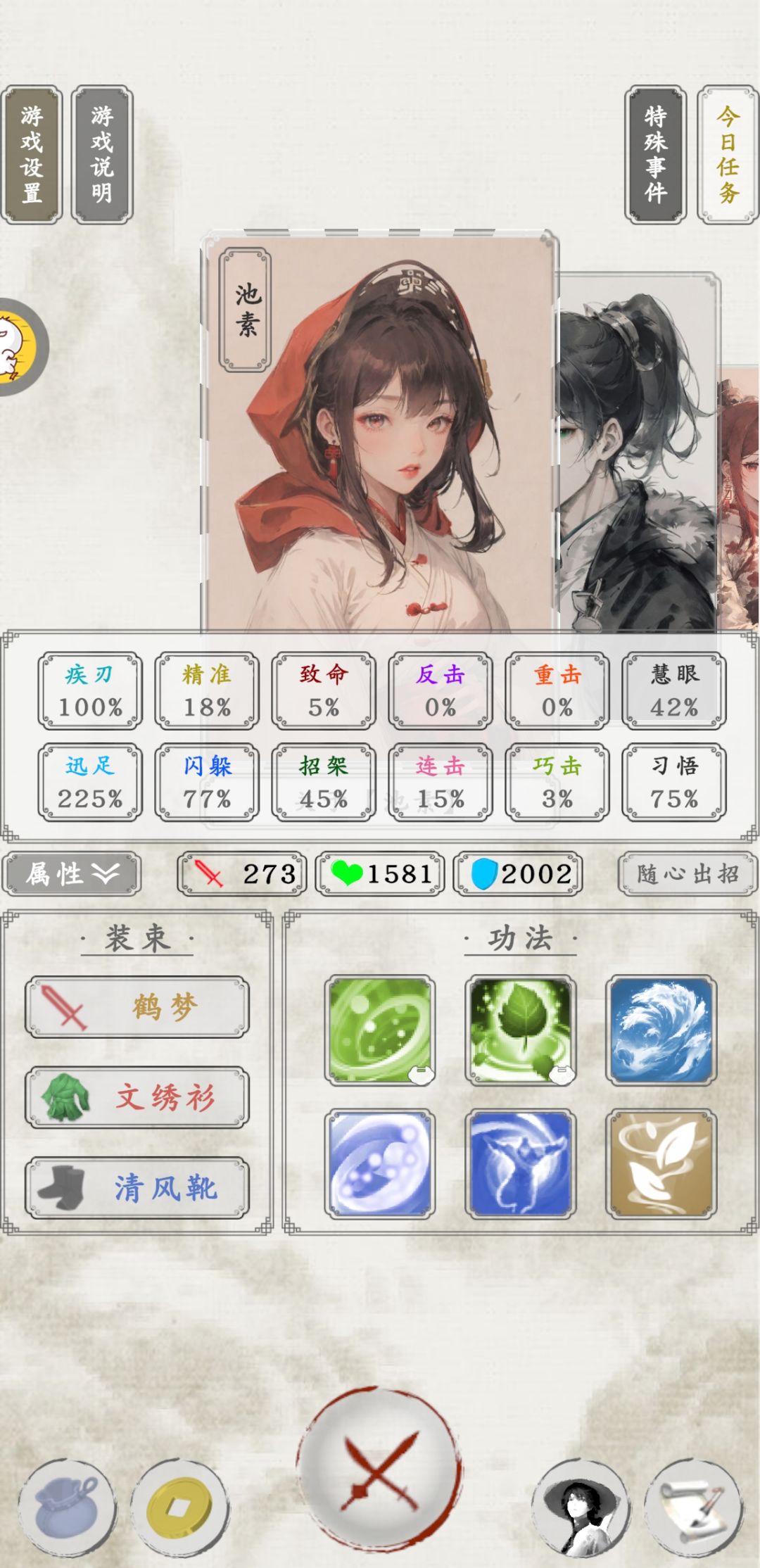 1.最厉害的角色是主角池素,没有之一,核心技+30% 闪避,而闪避属性最克制的刚好就是核心副本藏经阁(怪物低命中)。 2.池素搭配的必需技能是紫色技能步罡北斗,闪避的同时回复护盾。 重要技能包括金色技能沧流,大幅提升护盾上限;蓝色技能凭虚步,叠加清风靴(蓝色即可)轻松增加 40% 多闪避。 3.核心武器是带雨云(专属武器,紫色起步具备闪避词条)和鹤梦(增加经验,金色起步具备慧眼词条)。 4. 玩的