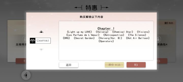 可能是托cytus有热度的福,也可能是命运的眷顾,我就这样在已经忘记它的那一刻遇见了它。不过解锁全部曲包要12块,这对于当时还是学生的我有些难办,因为根本没有可以支付的渠道。而且那时候还没学会找盗版,所以我叹了口气,卸载了。