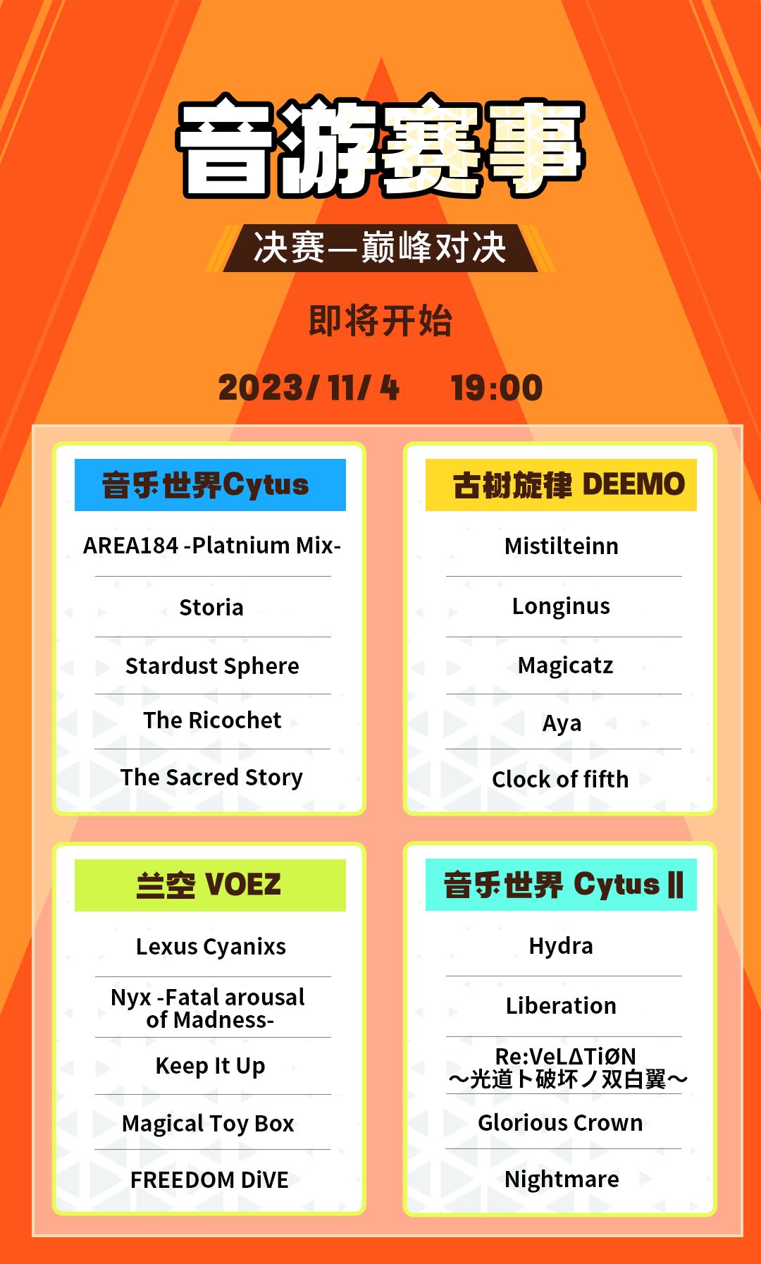 【赛事预告 | 音游决赛,巅峰开战!】 音游决赛比赛将于11月4日19点正式开启,在这场比赛中,我们邀请了顶尖选手为大家带来一场精彩纷呈的视听盛宴。欢迎大家届时前往我们的b站直播间观看赛事~ 所有音游社区平台将会持续更新赛事相关内容,记得及时查阅哦~