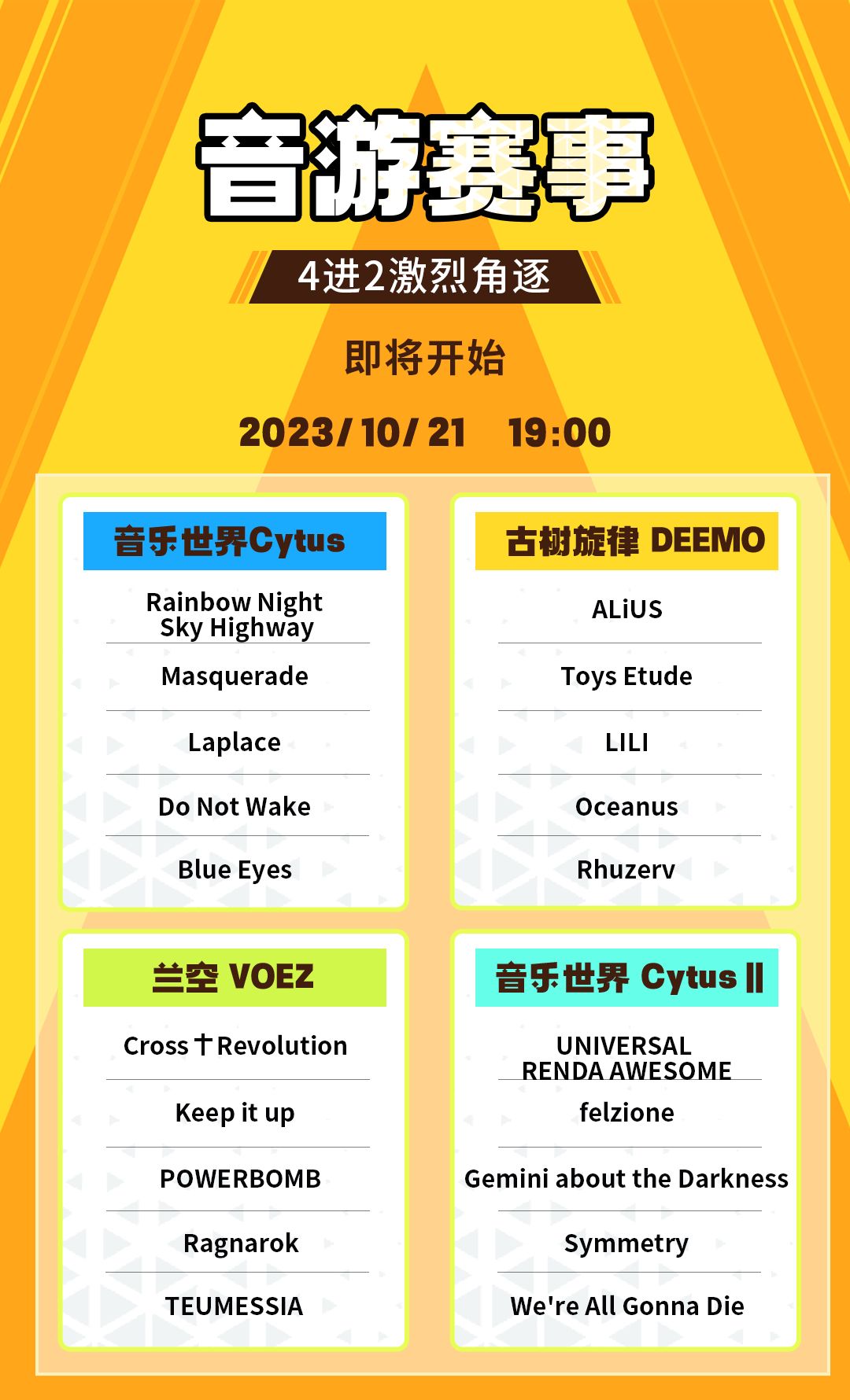 【赛事预告 | 音游4进2,即将开战!】 音游4进2比赛将于10月21日19点正式开启,在这场比赛中,我们邀请了顶尖选手为大家带来一场精彩纷呈的视听盛宴。欢迎大家届时前往我们的b站直播间观看赛事~ 所有音游社区平台将会持续更新赛事相关内容,记得及时查阅哦~