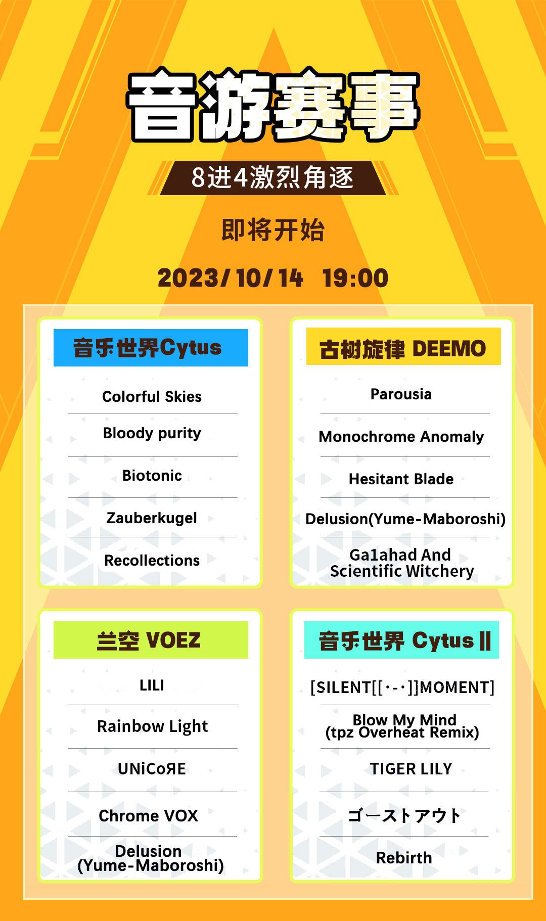 【赛事预告 | 音游8进4,即将开战!】 音游8进4比赛将于10月14日19点正式开启,在这场比赛中,我们邀请了顶尖选手为大家带来一场精彩纷呈的视听盛宴。欢迎大家届时前往我们的b站直播间观看赛事~ 所有音游社区平台将会持续更新赛事相关内容,记得及时查阅哦~