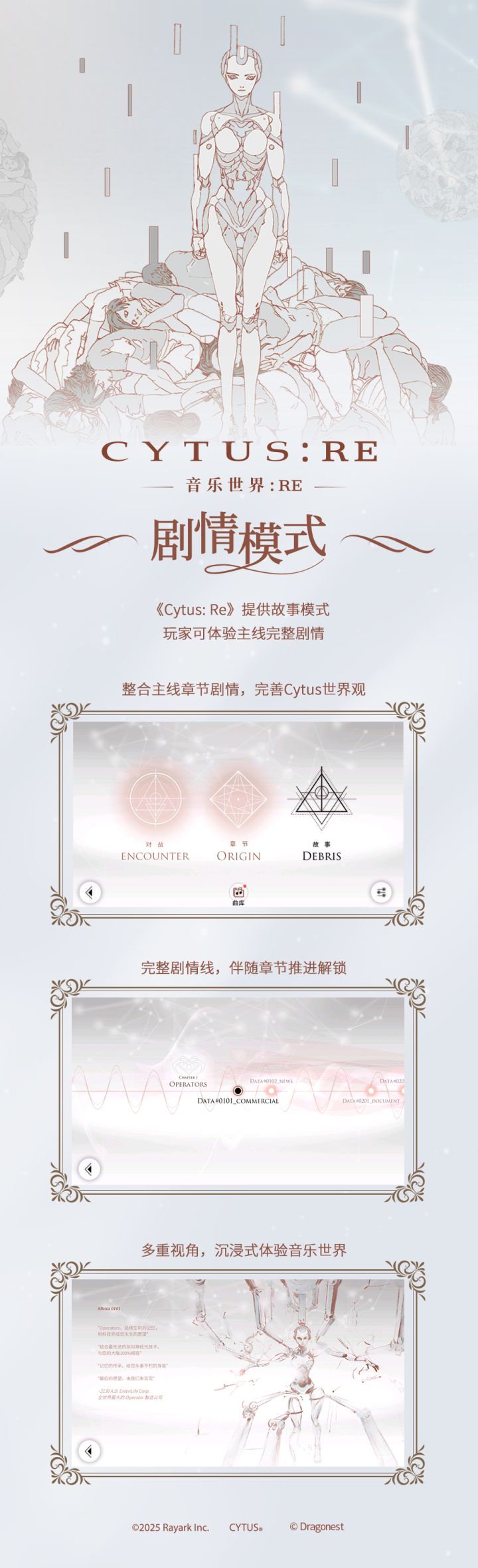重逢之际,五首限定曲现已解锁! 一起试听《Cytus: Re》限定章节曲目: ★ 华灯爱 / 闫东炜 ★ 满夏与距离 / 闫东炜 ★ 千户棠 / 闫东炜 ★ 香菱 / 闫东炜 ★ Autism / 闫东炜 ———— 《Cytus: Re》定档2025年1月23日,预购即将结束! ► 预购链接:https://r.dragonest.com/ ► 预购时间:2024年12月24日-2025年1月2