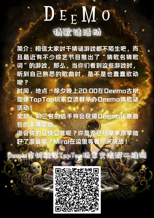 各位熱愛Deemo的小夥伴們,你們好!我是Mirai!時間過的真快,過了今天,除夕就到來了,那麼距離猜歌謎活動的舉行還有一天,想參加的小夥伴要抓緊時間了哦~凡是在活動舉行前入群的都可參與本次活動,讓我們一起猜歌,一起跨年吧~ Deemo猜歌謎活動舉行時間:除夕晚上20:00準時開始。 Deemo猜歌謎活動曲目範圍:Deemo全曲包試聽部分 V4.0版本。 Deemo猜歌謎活動規則說明:猜歌謎活動開