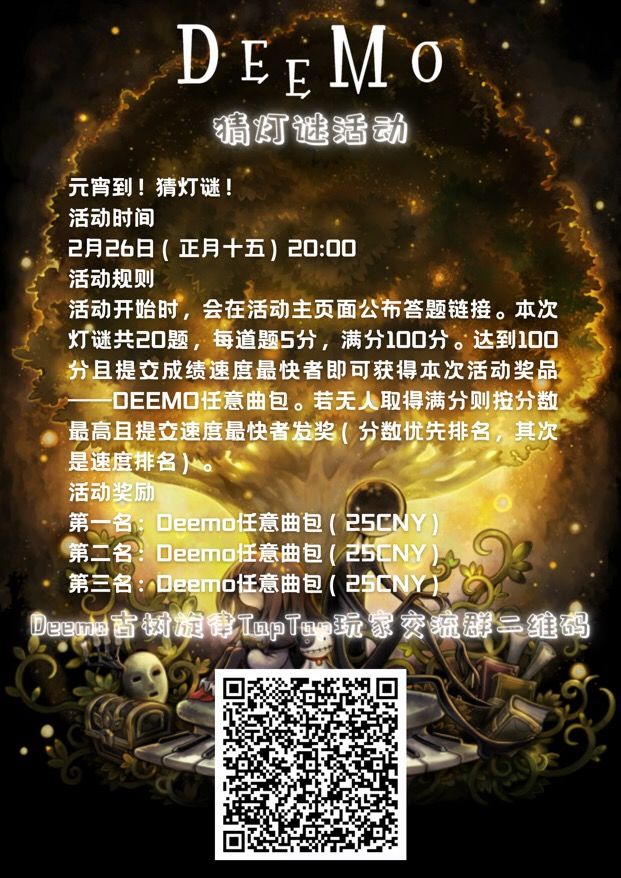 各位熱愛DEEMO的小夥伴們,元宵節猜燈謎活動即將到來!歡迎各位小夥伴們踴躍進群參加,前三名將會獲得DEEMO任意曲包獎勵,還有很多後續活動等待著你們,今天群里清理了一些不活躍的群員,假如有把你踢出去的情況記得再加進來哦~在群里有大神為你解答,在遊戲中遇到問題也可進群及時反饋,我會定期在群內收集整理反饋內容以及建議給Rayark官方,同時本次夏季音游大賽也獲得了Rayark官方的支持和肯定,歡迎各