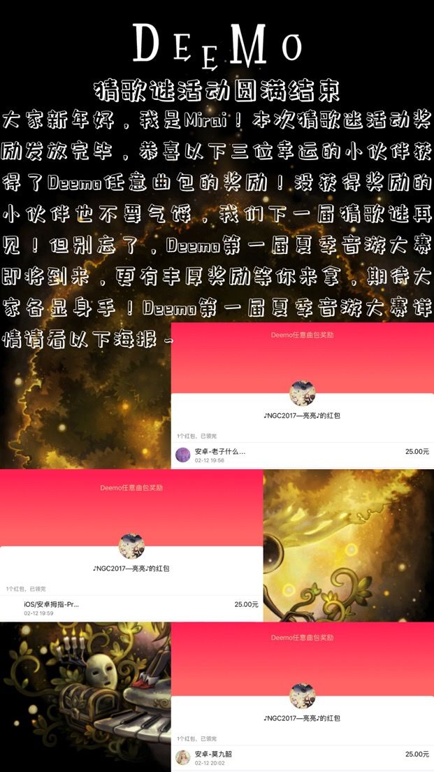 大家好,我是Mirai!Deemo猜歌謎活動圓滿結束,恭喜三位幸運的小夥伴獲得了Deemo任意曲包獎勵!同時感謝各位的捧場與支持,未獲獎的小夥伴也不要氣餒,Deemo第一屆夏季音游大賽報名正式開始!更有豐厚的獎品等你來拿!報名截止時間為5月1日,比賽時間還處於待定狀態,具體時間等進一步通知,歡迎大家踴躍參加和圍觀~