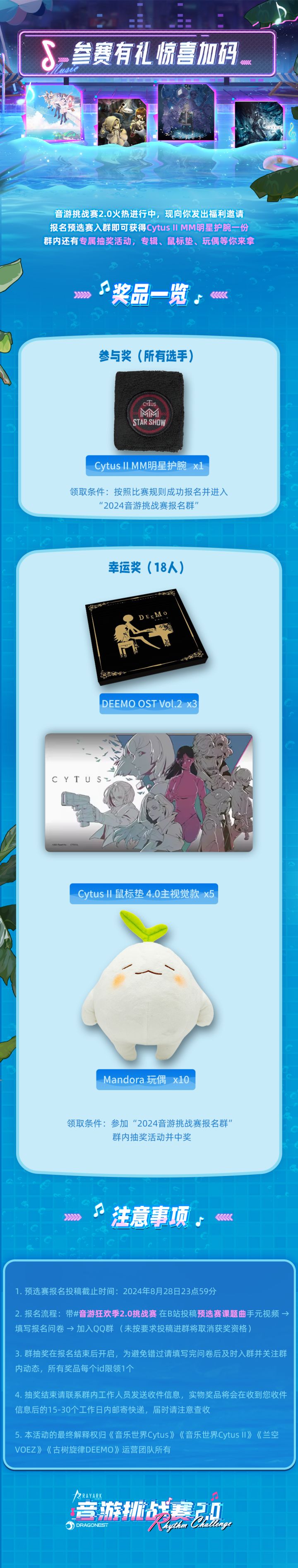 音游挑战赛2.0正式开启!4款音乐游戏《音乐世界Cytus》、《音乐世界Cytus II》、《古树旋律DEEMO》、《兰空VOEZ典藏版》再次向各位发起邀约!本次挑战赛分为预选赛、小组赛、淘汰赛和决赛,预选赛于今日正式拉开帷幕。我们准备了丰富的赛事福利和抽奖活动,快来一同奏响夏日狂欢旋律吧!报名详情请看下图:预选赛课题曲:-Cytus课题曲《Enormous Alpaca Devil in