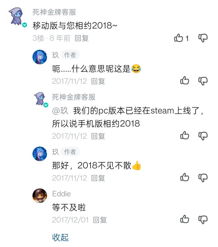 大家好,我是死神开发者兼客服!很高兴我们的主页在这样一个美好的周五悄悄上线了。搞定一切,我上线后看到了预约的数量,真是深深的被你们的热情震惊了。以后欢迎大家在这里为我们的游戏提出建议,帮助我们完善这个产品!我也会在这里跟大家分享开发心得和进度。我兼职客服的时间不长,从s平台上线开始到现在,真是每天每时每刻都被感动着。当我们解决了一个问题,让本来不能进入游戏的玩家可以正常游戏,玩家会说谢谢你,