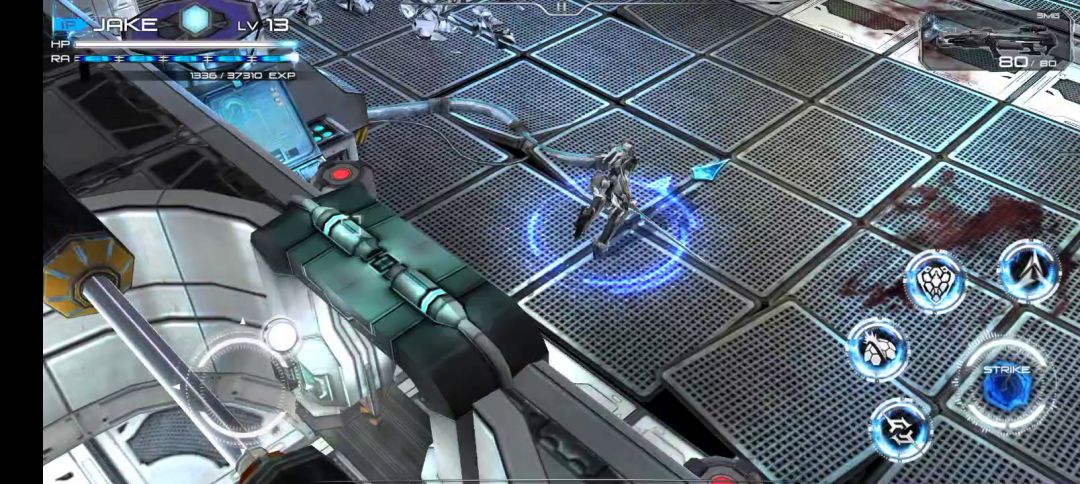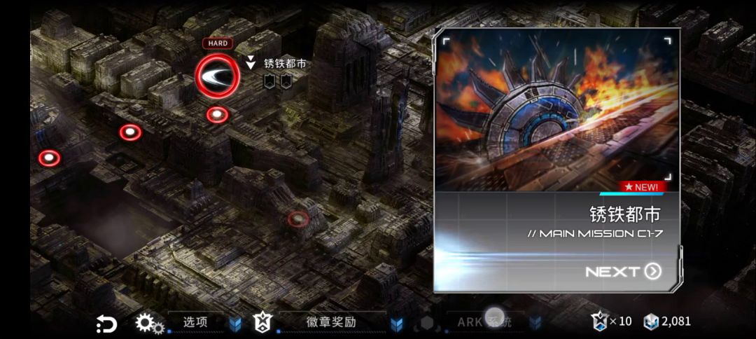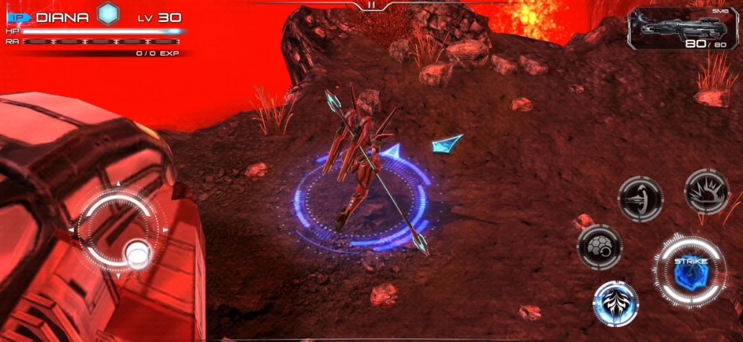 虚拟摇杆会随着手指的滑动进行移动,而右屏幕的主武器打击键,还隐藏着一个副武器,那就是枪炮的瞄准,当你按住打击键进行拖动以后,会马上激活副武器进行自动射击,只要熟练使用好以后,可以为整个战斗操作带来更为丰富的变化。
