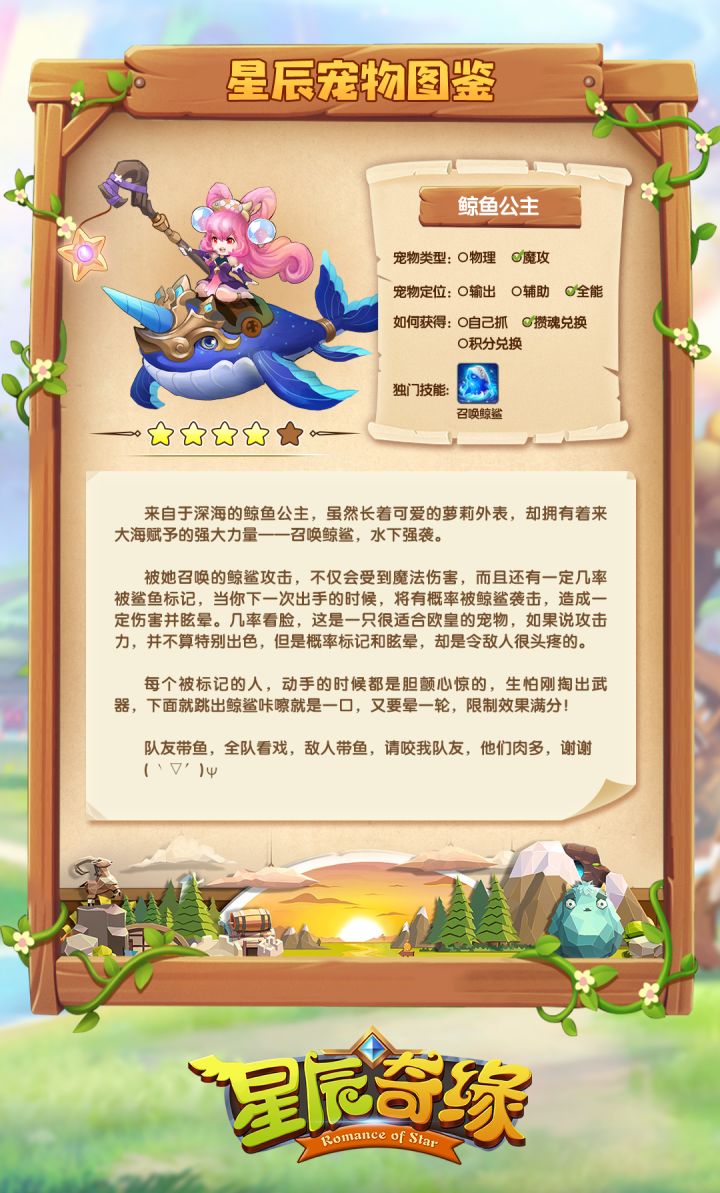 如果说在星辰里,有哪只宠物的技能和TA本身的形象反差最大,那么肯定所有人都要说是——鲸鱼公主,看起来外表就是个小萝莉,但是技能竟然是……!保证你猜不到,快往下面看吧!鲸鱼公主简直是游戏里的控场利器,记得鲸鱼公主刚出来的时候,大家还喜欢达成强魔攻的,但是后面很快就意识到,控制才是鲸鱼公主的宿命呀!因此后续就开始流行起了那种肉鱼,血厚防高,还能减伤回血,伤害是什么,不存在的,目标就是每回合咬对面一口