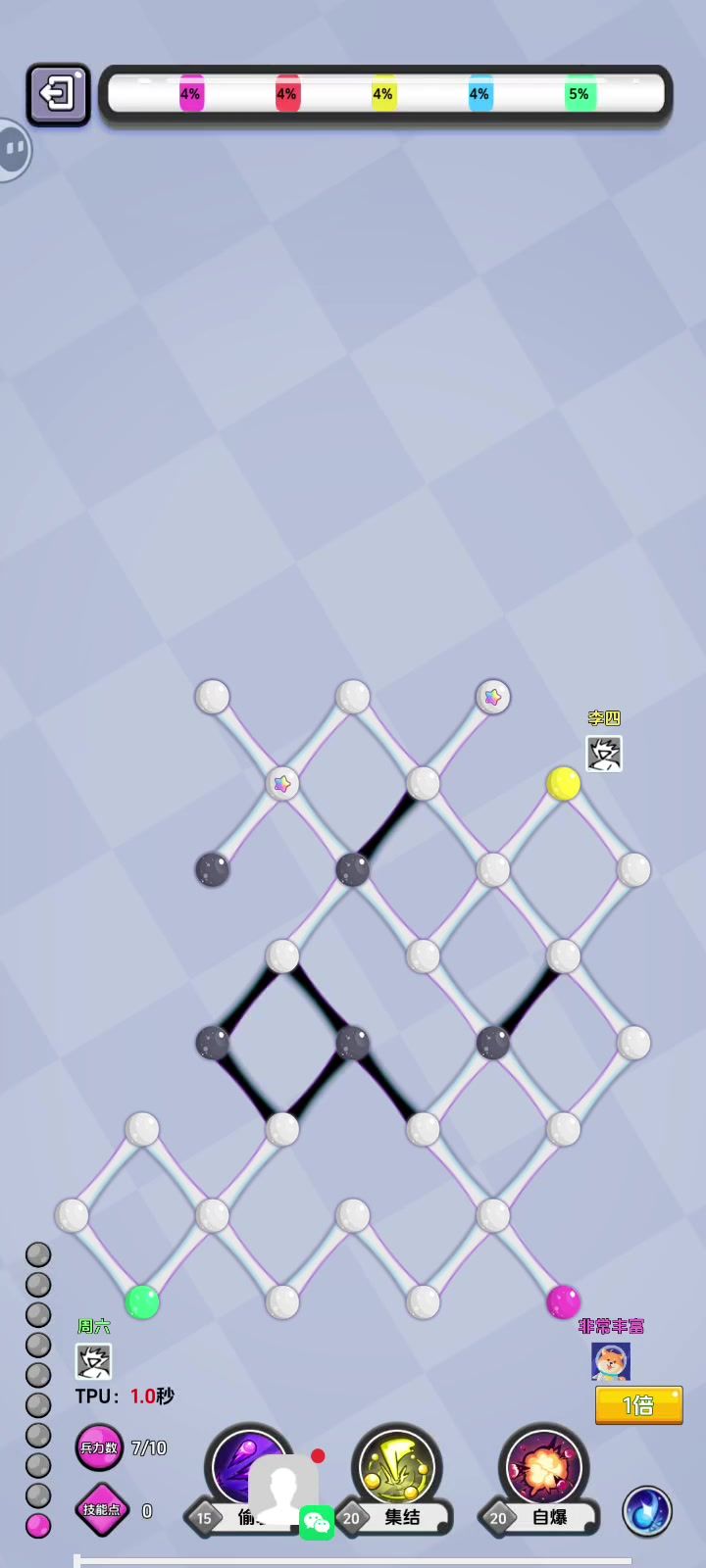 被卡在第七关的兄弟姐妹们。看过来ԅ(≖‿≖ԅ) 一开始肯定是要连桥的,不要等小绿发育。小绿四个老窝找准第一个占领门口母球的老窝,架桥冲锋。 攒够 30 个技能点就引爆,这技能出来的球是往四个方向跑的,要手动把旁边两路摆回来,手速要快哦。 占领一个星星球立刻干另一个,有技能点就用技能。速度要快,不要给小绿两路会师的时间。占领第二个星星球立刻守住关键节点,上三个守卫。 把大部分兵力都用来防御,偶尔抽出
