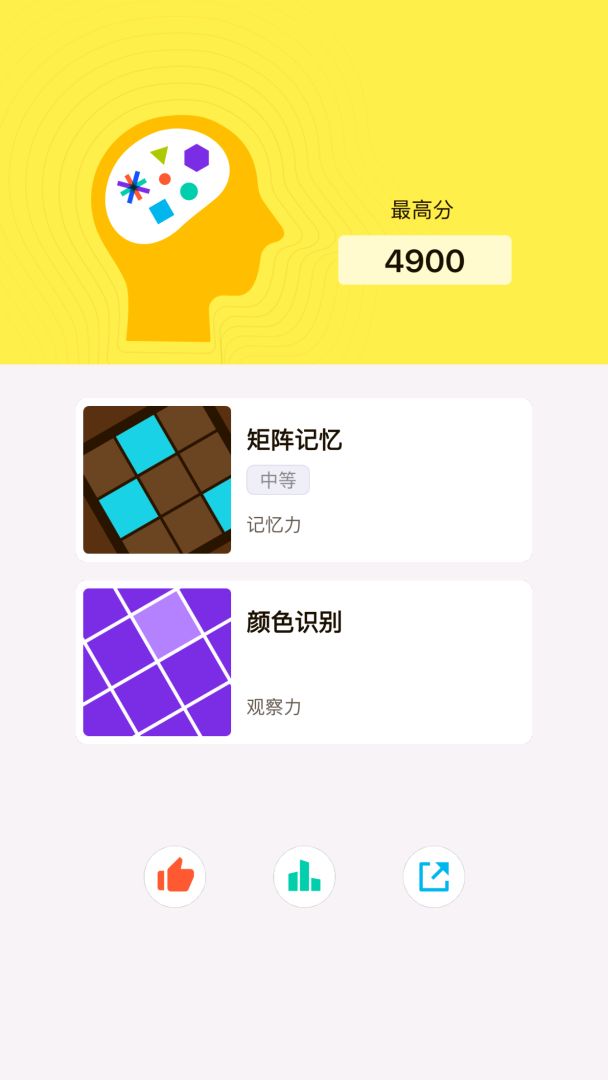 我们新开发了一个训练观察力的功能:颜色识别。你需要从屏幕上的格子中选择不一样颜色格子,选正确即可过关,而选错则要扣除一定的分数。该项功能可以帮助你训练视觉能力、反应...