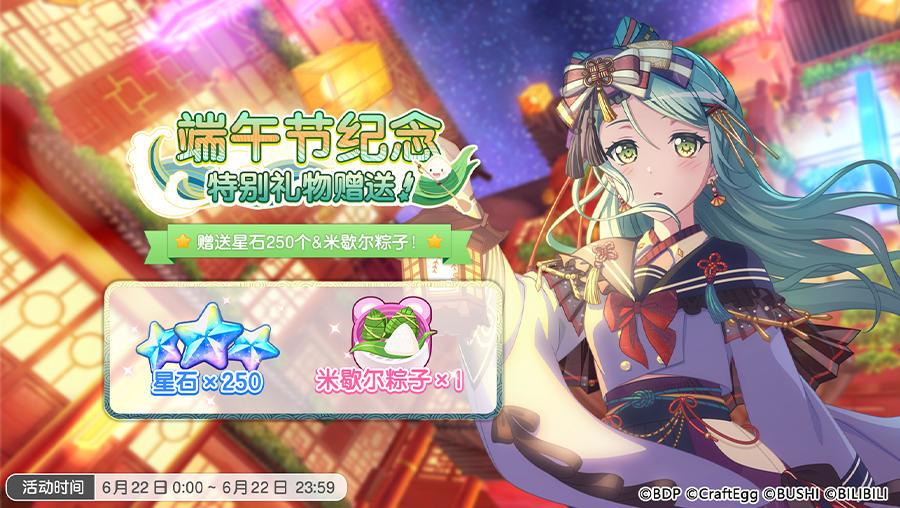 各位亲爱的BanG Dreamer: 粽意飘香,今天是端午节!CiRCLE哔哩店为大家送上了端午节礼物——原创道具「米歇尔粽子」+「星石×250」,还请记得登录游戏获取哦~ 祝大家端午安康!(✪ω✪) ★领取时间★ 6月22日0:00~6月22日23:59 ★礼物内容★ 星石×250 米歇尔粽子×1 今后也请多多支持《BanG Dream! 少女乐团派对!》!