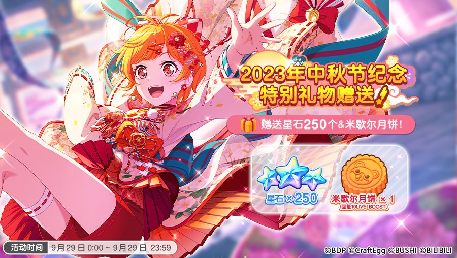 各位亲爱的BanG Dreamer: 喜迎中秋佳节到来,大家今天都吃月饼了吗? CiRCLE哔哩店为大家准备了中秋节特别礼物,祝大家生活幸福,团团圆圆(=゚ω゚)ノ ★活动时间★ 9月29日0:00~23:59 ★登录奖励★ 中秋节当日登录游戏,即可领取节日限定礼物「米歇尔月饼×1」+「星石×250」♪ 今后也请多多支持《BanG Dream! 少女乐团派对!》!