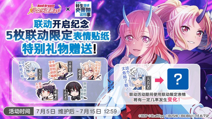 各位亲爱的BanG Dreamer: 7月5日联动活动开启后,游戏内将赠送联动福利——特别礼物「Morfonica乐队5位成员的联动限定表情」!活动期间内,使用联动限定表情将有一定几率看到表情发生变化!此外,联动表情仅限活动期间限时领取,且暂无其他获取途径,还请不要错过哦~ ★活动时间★ 7月5日维护后~7月15日12:59 ★赠送内容★ ·Morfonica乐队成员的联动限定表情×5