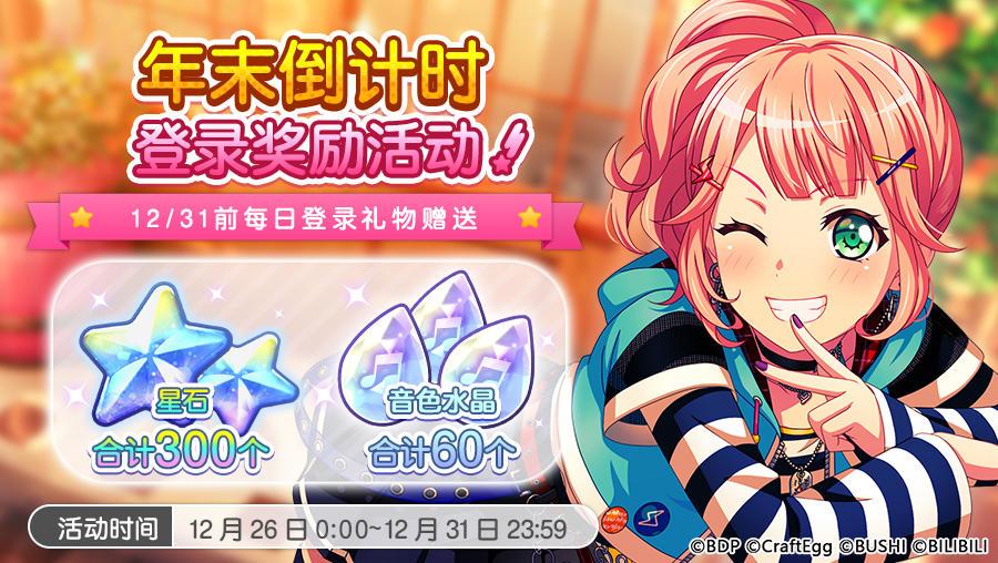 各位亲爱的BanG Dreamer: 为了迎接2023年元旦的到来,明日起,游戏内将开展「年末倒计时登录奖励活动」,活动期间内每日登录游戏都可领取登录奖励! ★活动时间★ 12月26日00:00~12月31日23:59 ★登录奖励★ 每天登录可领「星石×50」+「音色水晶×10」,累计可得「星石×300」+「音色水晶×60」! 今后也请多多支持《BanG Dream! 少女乐团派对!》!