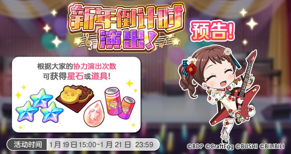 各位亲爱的BanG Dreamer: 1月19日,游戏内将开启「新年倒计时演出!」活动,各位可以通过参加「新年倒计时演出!」获得最高星石×1000以及各种丰富奖励哦,让我们为兔年新春的到来献上最盛大的演出吧~ ★活动日程★ 【参与期间】 2023年1月19日 15:00~2023年1月21日 23:59 【结算期间】 2023年1月22日0:00~ 2023年1月22日0:09 【结果发表时间】 2