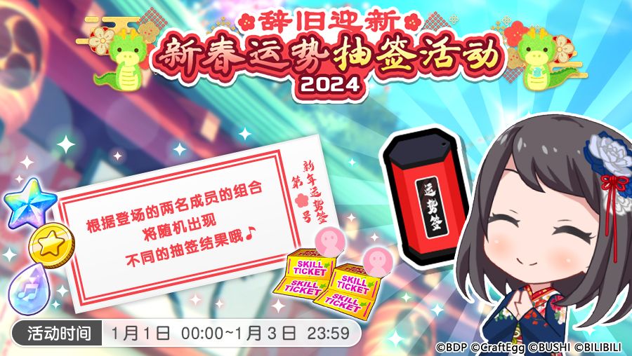为了纪念2024年元旦的到来,1月1日0点起至1月3日23:59期间,游戏内将开展连续3天的抽签活动,各位可以通过点击左下角「辞旧迎新活动」图标,进入活动专题页面参与活动哦! 1月4日0点起,大家还可以登录游戏查看所有成员2人组合的签文内容,今年整体运势与开运秘诀,还请多多期待哦~ ★活动内容★ 1月1日0:00~1月3日23:59,每日登录游戏都可进行1次抽签,并根据抽签结果获得对应礼物!抽