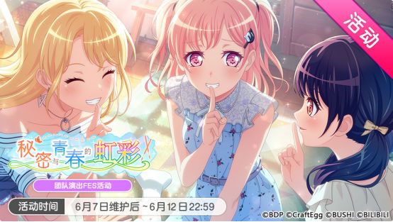 各位亲爱的BanG Dreamer: 6月7日维护后,游戏内将开启全新活动形式——「秘密与青春的虹彩」团队演出FES活动和「月光洒落的Night Gallery 招募」以及「月光洒落的Night Gallery 限定1次超值招募」;并追加原创歌曲《Secret Dawn》! 一、「秘密与青春的虹彩」团队演出FES活动开启! ★活动日程★ 6月7日维护后~6月12日22:59 ★活动简介★ ●活动报