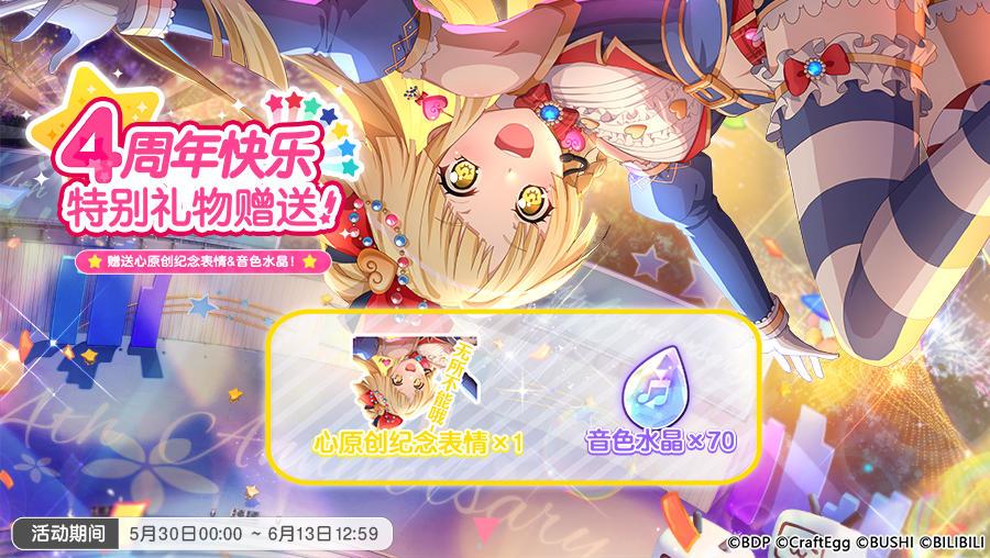 祝各位亲爱的BanG Dreamer4周年快乐♪ 活动期间,登录游戏可以获得特别礼物哦!记得登录游戏领取礼物,一同庆祝4周年纪念日吧\(>0<)/ ★活动时间★ 5月30日00:00~6月13日12:59 ★特别礼物★ 心原创表情×1+音色水晶×70 今后也请多多支持《BanG Dream! 少女乐团派对!》!