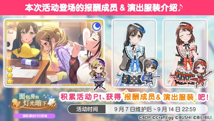 积累活动Pt即可获得附赠演出服装的全新活动报酬成员——★3 市谷有咲[送上抚慰的话语]以及花园多惠与户山香澄的全新演出服装! 本期活动将于9月14日22:59结束,快来参与活动吧~ 今后也请多多支持《BanG Dream! 少女乐团派对!》!