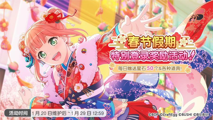各位亲爱的BanG Dreamer: 为庆祝2023年兔年春节,游戏内将于1月20日维护后开启「春节假期 登录奖励活动」!活动期间内登录游戏可累计获得350星石、练习券(高级)等丰富道具奖励,还请不要错过~ ★活动时间★ 1月20日维护后~1月29日12:59 ★登录奖励★ 第1日:Pure属性碎片(大)×50;Pure属性碎片(中)×300;Pure属性碎片(小)×500;星石×50 第2日:H