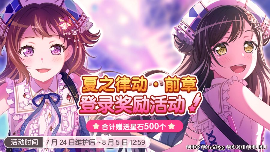 各位亲爱的BanG Dreamer: 7月24日,游戏内将开展「夏之律动·前章 登录奖励活动」! 每日登录都可以获得星石,共计可获得「星石×500」♪ ★活动时间★ 7月24日维护后~8月5日 12:59 ★登录奖励★ 每日可获得「星石×50」,最多可领取10天。 今后也请多多支持《BanG Dream! 少女乐团派对!》!