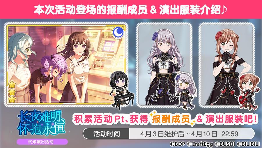 积累活动Pt即可获得附赠演出服装的全新活动报酬成员——★3 白金燐子[令人平静的归途]以及友希那与莉莎的全新演出服装!! 本期活动将于4月10日22:59结束,快来参与活动吧~ 今后也请多多支持《BanG Dream! 少女乐团派对!》!
