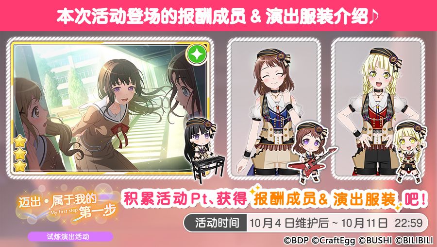 积累活动Pt即可获得附赠演出服装的全新活动报酬成员——★3 白金燐子[收下我的声援]以及户山香澄与弦卷心的全新演出服装! 本期活动将于10月11日22:59结束,快来参与活动吧~ 今后也请多多支持《BanG Dream! 少女乐团派对!》!