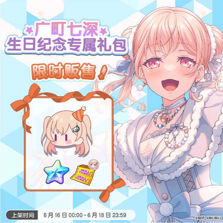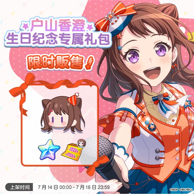 各位亲爱的BanG Dreamer: 本周登录礼包「KiraKira Gift」现已发放!内含【小型Live Boost饮料×2、HelloHappy专用技能练习券x1、Pure属性碎片(小)】,仅限7月14日19:00~7月16日23:59期间登录游戏领取,还请不要错过(〃'▽'〃) 祝大家周末愉快! 今后也请多多支持《BanG Dream! 少女乐团派对!》!