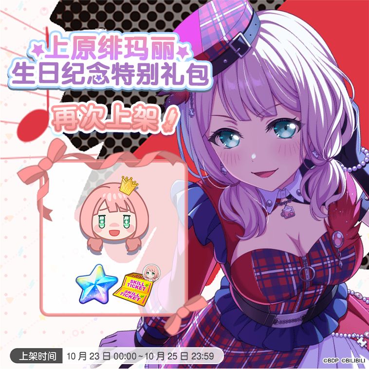 各位亲爱的BanG Dreamer: 本周登录礼包「KiraKira Gift」现已发放!内含【小型Live Boost饮料×2、PasPale专用技能练习券x1、Powerful属性碎片(小)x50】,仅限10月20日19:00~10月22日23:59期间登录游戏领取,还请不要错过(〃'▽'〃) 祝大家周末愉快! 今后也请多多支持《BanG Dream! 少女乐团派对!》!