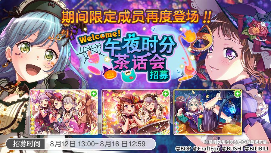 各位亲爱的BanG Dreamer: 8月12日,游戏内将再次开启期间限定招募「Welcome! 午夜时分茶话会招募」,期间限定成员再度登场! 再度登场的期间限定成员相比同稀有度其他成员出现概率提升! ★招募日程★ 招募时间:8月12日13:00~8月16日12:59 ★招募简介★ 再度登场期间限定成员: ★4 LOCK[一起万圣节!] ★4户山香澄[甜蜜时间] ★3青叶摩卡[黑猫带路中] ※本招