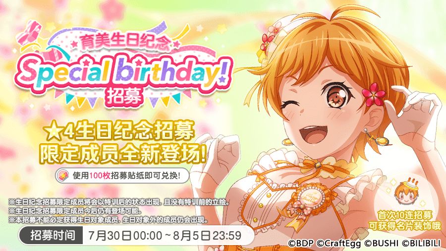 明天(7月30日)就是育美生日了,后台已开放育美生日主题相关对话哦~ 此外,明日起,游戏内还将限时开放「育美生日纪念招募」!生日纪念限定成员的出现概率相比同稀有度其他成员出现概率提升!首次参与10连招募即可获得生日纪念限定名片装饰,且生日纪念限定招募成员仅需100枚招募贴纸即可兑换,还请不要错过哦! ★招募日程★ 7月30日0:00~8月5日23:59 ★招募简介★ 「育美生日纪念招募」生日纪念限