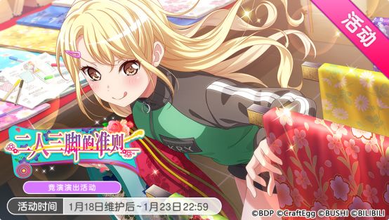 各位亲爱的BanG Dreamer: 1月18日维护后,游戏内将开启「二人三脚的准则」竞演演出活动和「缭乱 灿烂辉煌招募」,并追加翻唱歌曲《Northern lights》!此外,还将更新「米歇尔贴纸交换所」的交换内容和「★★★以上确定招募」,欢迎大家登录游戏查看~ 一、「二人三脚的准则」竞演演出活动开启! ★活动日程★ 活动时间:1月18日维护后~1月23日22:59 ★活动简介★ ●活动报酬成